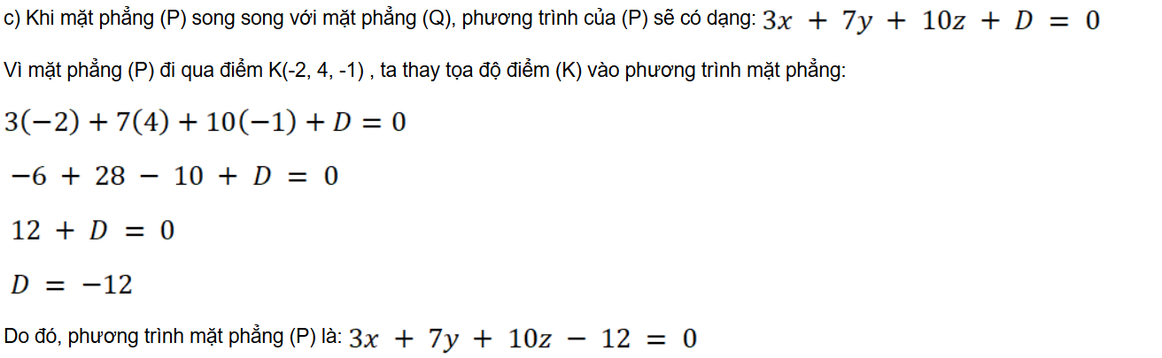 c) (P) đi qua điểm K(– 2; 4; – 1) và song song với mặt phẳng (Q): 3x + 7y + 10z + 1 = 0.