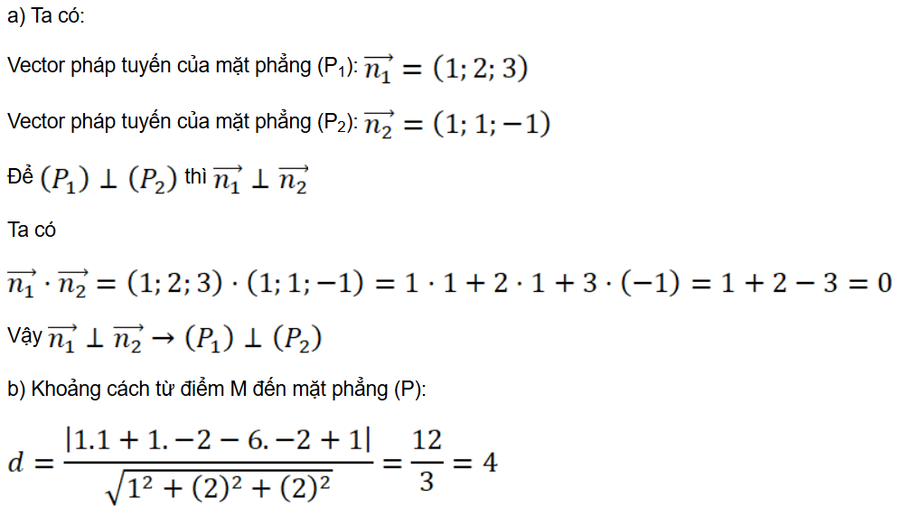 b) Chọn điểm M ∈ (P1). Suy ra khoảng cách từ điểm M đến mặt phẳng (P2) là: .