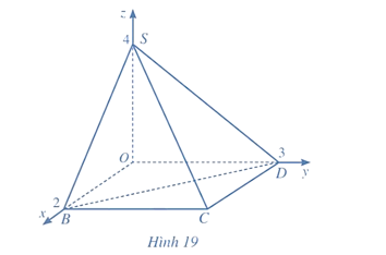 Bài tập 10: Trong không gian với hệ toạ độ Oxyz, cho hình chóp S.OBCD có đáy là hình chữ nhật và các điểm O(0; 0; 0), B(2; 0; 0), D(0; 3; 0), S(0; 0; 4) (Hình 19).