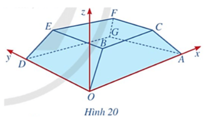 Bài tập 11: Hình 20 minh họa hình ảnh một tòa nhà trong không gian với hệ tọa độ Oxyz (đơn vị trên mỗi trục tọa độ là mét). Biết A(50; 0; 0), D(0; 20; 0), B(4k; 3k; 2k) với k > 0 và mặt phẳng (CBEF) có phương trình là z = 3.