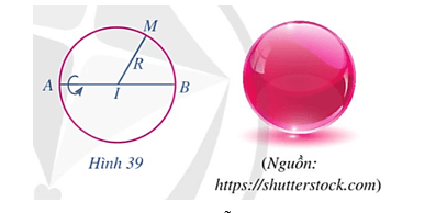 Hoạt động 1: Nếu quay đường tròn tâm I bán kính R quanh đường kính AB một vòng (Hình 39) thì hình tạo thành được gọi là mặt cầu. Những điểm thuộc mặt cầu đó cách I một khoảng bằng bao nhiêu?