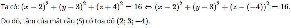 Bài tập 1: Tâm của mặt cầu (S): (x – 2)2 + (y – 3)2 + (z + 4)2 = 16 có tọa độ là: