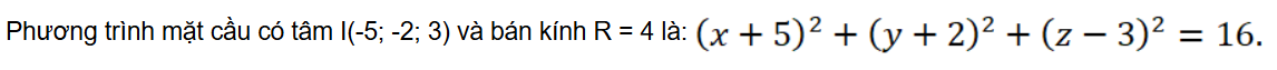 Bài tập 3: Mặt cầu (S) tâm I(– 5; – 2; 3) bán kính 4 có phương trình là:
