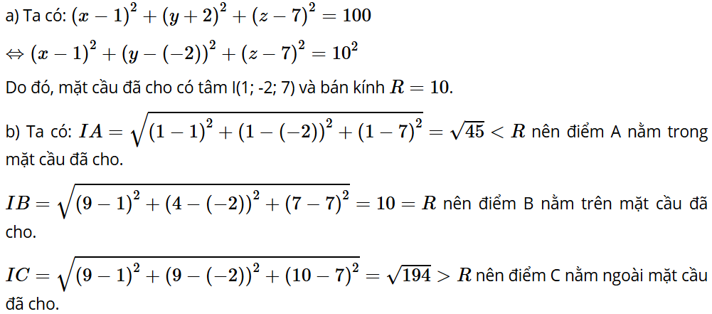 b) Mỗi điểm A(1; 1; 1), B(9; 4; 7), C(9; 9; 10) nằm trong, nằm ngoài hay nằm trên mặt cầu đó?