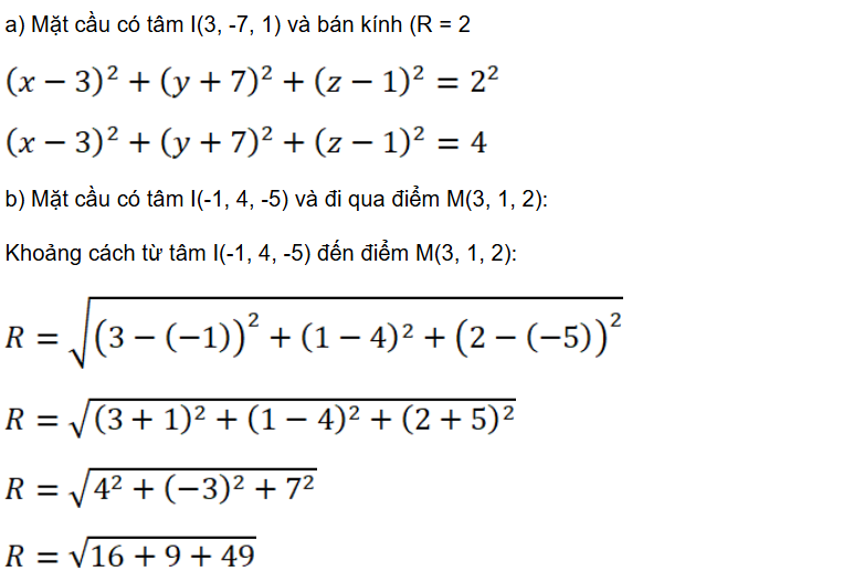 Bài tập 4: Cho mặt cầu có phương trình (x – 1)2 + (y + 2)2 + (z – 7)2 = 100.