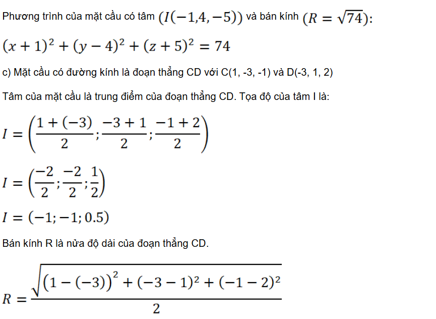 c) (S) có đường kính là đoạn thẳng CD với C(1; – 3; – 1) và D(– 3; 1; 2).