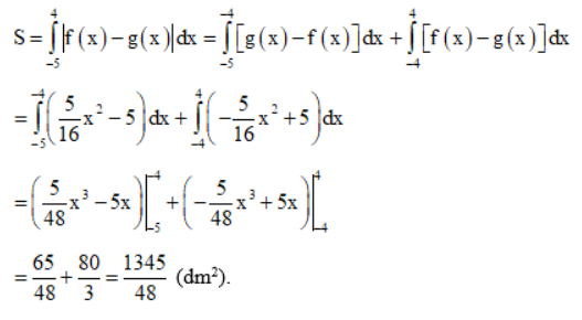 Để tính được diện tích của logo ta cần xác định các hàm số f(x) và g(x), sau đó sử dụng tích phân để tính diện tích hình phẳng giới hạn bởi các đồ thị hàm số f(x), g(x) và hai đường thẳng x = – 5, x = 4.