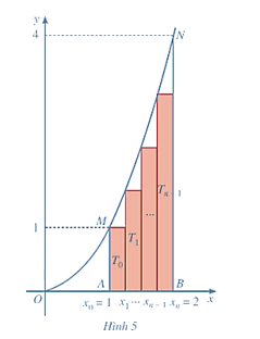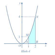 Hoạt động 1: Cho hàm số y = f(x) = x2. Xét hình phẳng (được tô màu) gồm tất cả các điểm M(x; y) trên mặt phẳng tọa độ sao cho 1 ≤ x ≤ 2 và 0 ≤ y ≤ x2 (Hình 4). Hình phẳng đó được gọi là hình thang cong AMNB giới hạn bởi đồ thị của hàm số f(x) = x2, trục Ox và hai đường thẳng x = 1, x = 2.