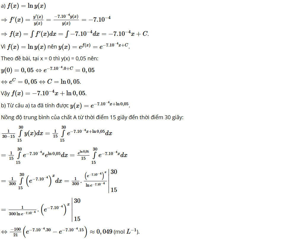 b) Giả sử ta tính nồng độ trung bình chất A (đơn vị mol L– 1) từ thời điểm a (giây) đến thời điểm b (giây) với 0 < a < b theo công thức . Xác định nồng độ trung bình của chất A từ thời điểm 15 giây đến thời điểm 30 giây.