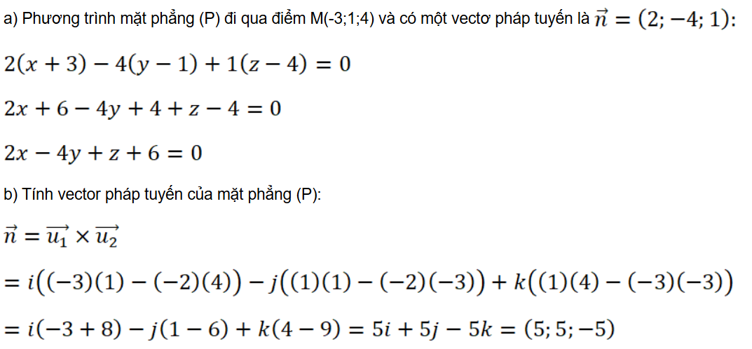 a) (P) đi qua điểm M(– 3; 1; 4) và có một vectơ pháp tuyến là ;