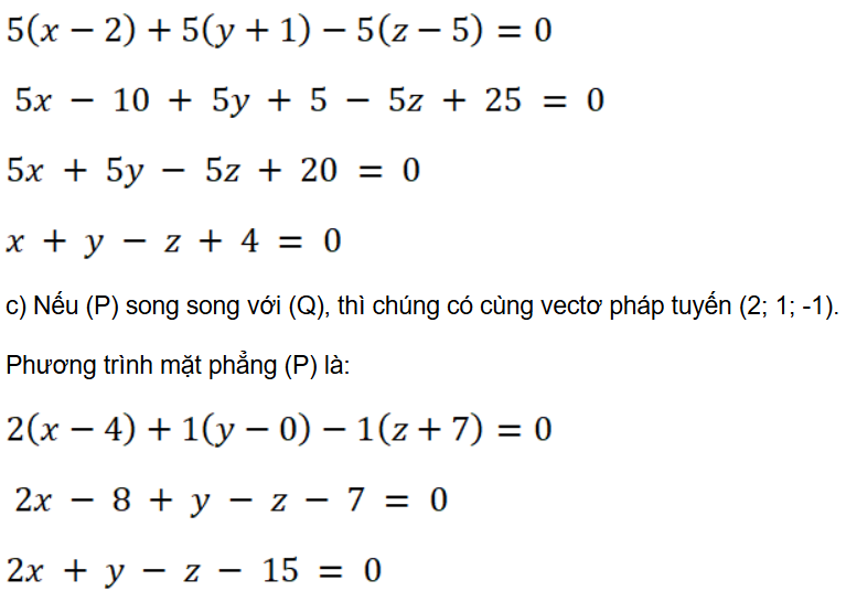 c) (P) đi qua điểm I(4; 0; – 7) và song song với mặt phẳng (Q): 2x + y – z – 3 = 0;