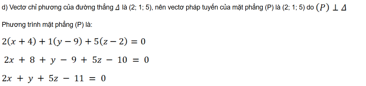 d) (P) đi qua điểm K(– 4; 9; 2) và vuông góc với đường thẳng