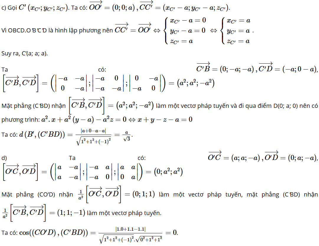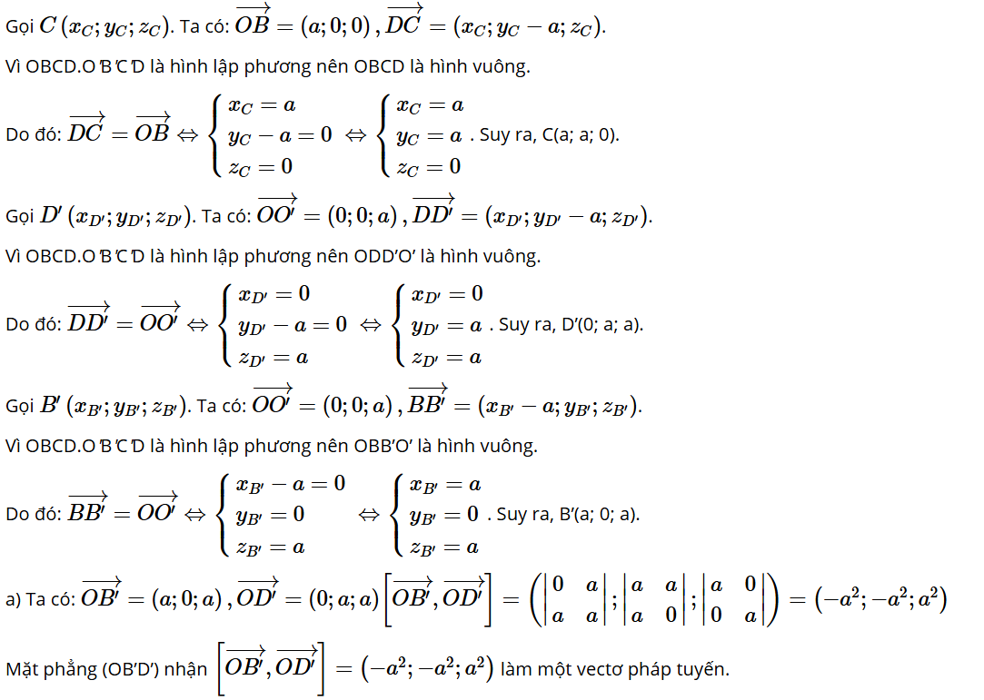 Bài tập 12: Trong không gian với hệ trục toạ độ Oxyz, cho hình lập phương OBCD.O'B'C'D' có O(0; 0; 0), B(a; 0; 0), D(0; a; 0), O'(0; 0; a) với a > 0.