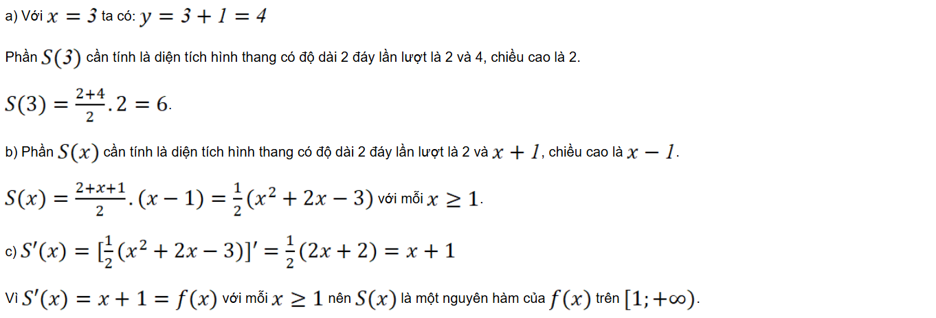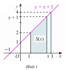Hoạt động khám phá 1: Cho hàm số y = f(x) = x + 1. Với mỗi x ≥ 1, kí hiệu S(x) là diện tích của hình thang giới hạn bởi đồ thị hàm số y = f(x), trục hoành và hai đường thẳng vuông góc với Ox tại các điểm có hoành độ 1 và x.