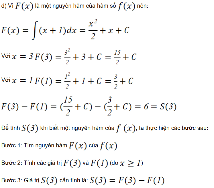 d) Cho F(x) là một nguyên hàm của hàm số f(x). Chứng tỏ rằng F(3) – F(1) = S(3). Từ đó nhận xét về cách tính S(3) khi biết một nguyên hàm của f(x).