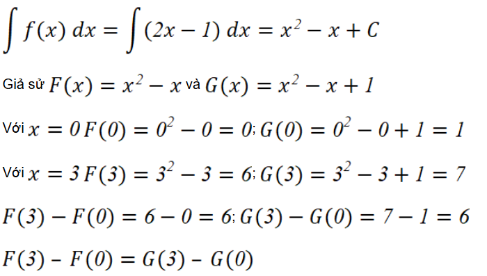 Hoạt động khám phá 2: Cho hàm số f(x) = 2x – 1. Lấy hai nguyên hàm tùy ý F(x) và G(x) của f(x), rồi tính F(3) – F(0) và G(3) – G(0). Nhận xét về kết quả nhận được.