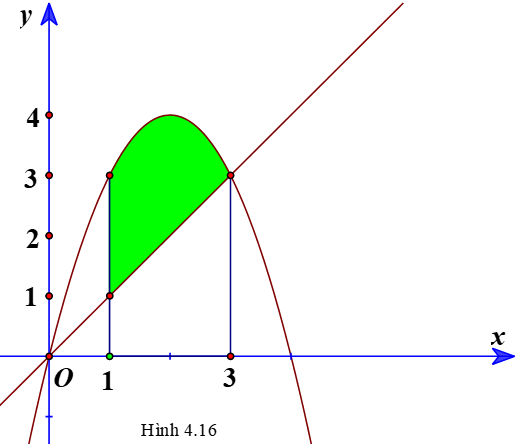 Hoạt động 2: Gọi S là diện tích hình phẳng giới hạn bởi đồ thị của các hàm số f(x) = −x2 + 4x, g(x) = x và hai đường thẳng x = 1, x = 3 (H.4.16).