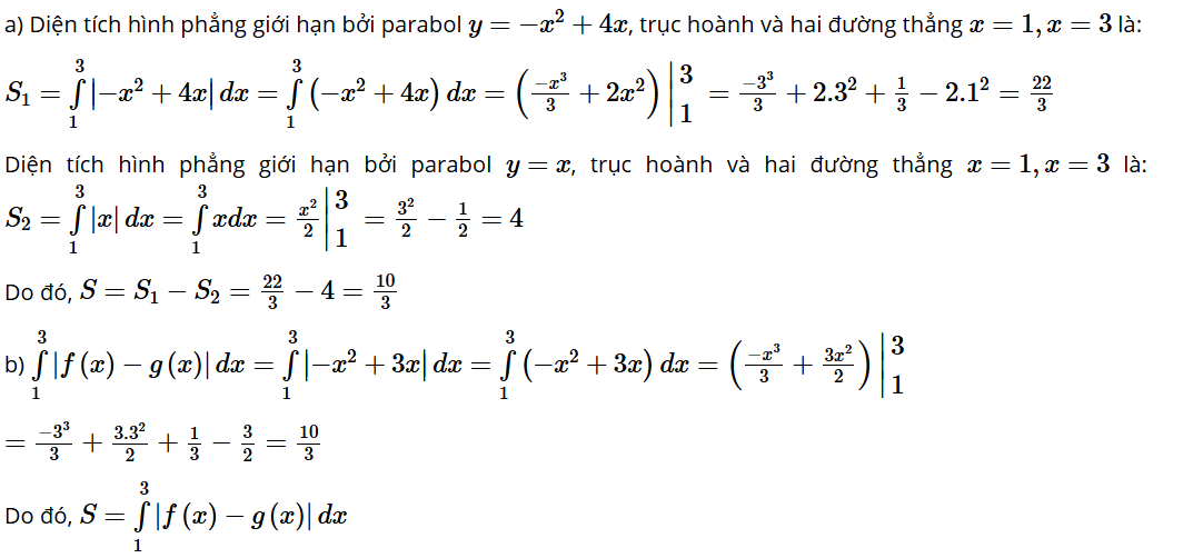 a) Giả sử S1 là diện tích hình phẳng giới hạn bởi parabol y = −x2 + 4x, trục hoành và hai đường thẳng x = 1, x = 3; S2 là diện tích hình phẳng giới hạn bởi đường thẳng y = x, trục hoành và hai đường thẳng x = 1, x = 3. Tính S1, S2 và từ đó suy ra S.