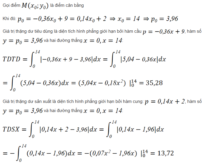 Hàm cầu: p = −0,36x + 9 và hàm cung: p = 0,14x + 2, trong đó x là số đơn vị sản phẩm. Tìm thặng dư tiêu dùng và thặng dư sản xuất cho sản phẩm này.