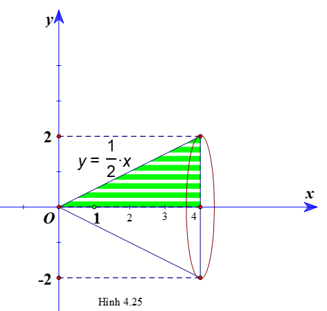 Hoạt động 4: Xét hình phẳng giới hạn bởi đồ thị hàm số , trục hoành và hai đường thẳng x = 0, x = 4. Khi quay hình phẳng này xung quanh trục hoành Ox ta được khối nón có đỉnh là gốc O, trục là Ox và đáy là hình tròn bán kính bằng 2 (H.4.25).