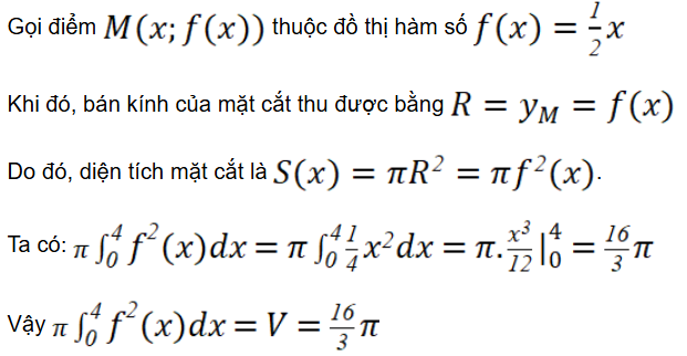 b) Chứng minh rằng khi cắt khối nón bởi mặt phẳng vuông góc với trục hoành tại điểm có hoành độ bằng x (0 ≤ x ≤ 4) thì mặt cắt thu được là một hình tròn có bán kính là f(x), do đó diện tích mặt cắt là S(x) = πf2(x). Tính và so sánh với V.