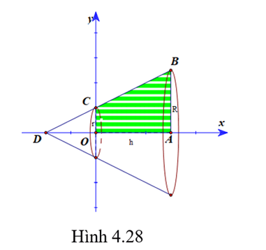 a) Tính thể tích của khối tròn xoay sinh ra khi quay hình thang vuông OABC trong mặt phẳng Oxy với OA = h, AB = R và OC = r, quanh trục Ox (H.4.28).