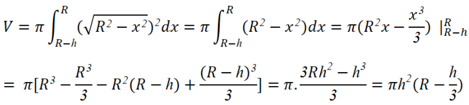 Bài 4.18: Khối chỏm cầu có bán kính R và chiều cao h (0 < h ≤ R) sinh ra khi quay hình phẳng giới hạn bởi cung tròn có phương trình , trục hoành và hai đường thẳng x = R – h, x = R xung quanh trục Ox (H.4.30). Tính thể tích của khối chỏm cầu này.