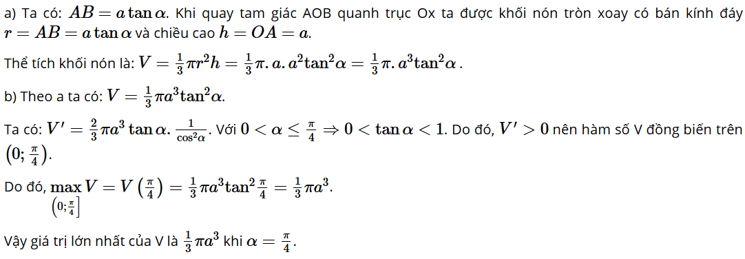 Bài 4.19: Cho tam giác vuông OAB có cạnh OA = a nằm trên trục Ox và . Gọi β là khối tròn xoay sinh ra khi quay miền tam giác OAB xung quanh trục Ox (H.4.31).