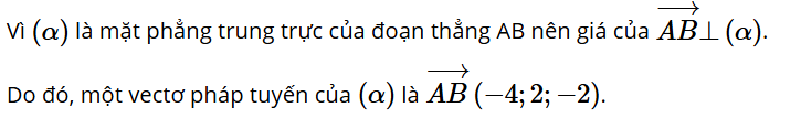 Luyện tập 1: Trong không gian Oxyz, cho các điểm A(1; −2; 3), B(−3; 0; 1). Gọi (α) là mặt phẳng trung trực của đoạn thẳng AB. Hãy chỉ ra một vectơ pháp tuyến của (α).