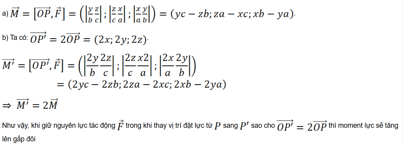 b) Giải thích vì sao, nếu giữ nguyên lực tác động trong khi thay vị trí đặt lực từ P sang P' sao cho thì moment lực sẽ tăng lên gấp đôi. Từ đó, ta có thể rút ra điều gì để đỡ tốn sức khi dùng mỏ lết vặn ốc?