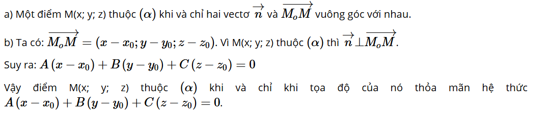 a) Một điểm M(x; y; z) thuộc (α) khi và chỉ khi hai vectơ và có mối quan hệ gì?