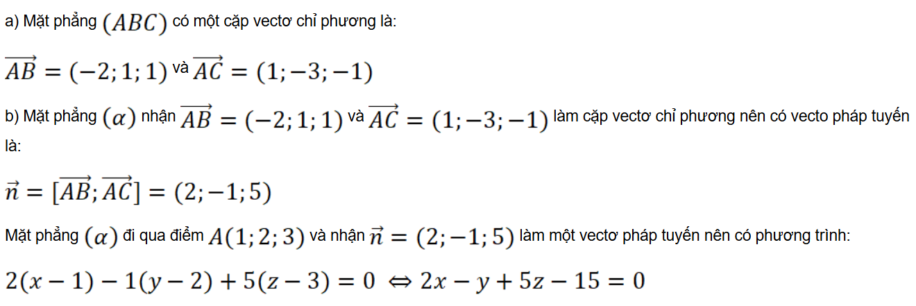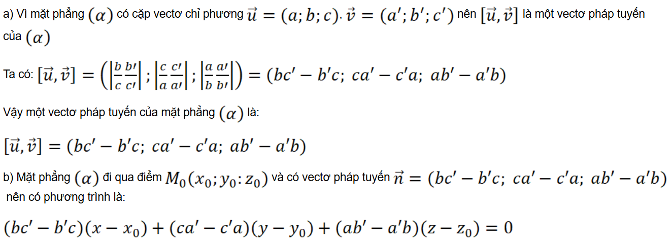 Mặt phẳng (α) nhận và làm một cặp vectơ chỉ phương. Do đó mặt phẳng (α) nhận làm một vectơ pháp tuyến.