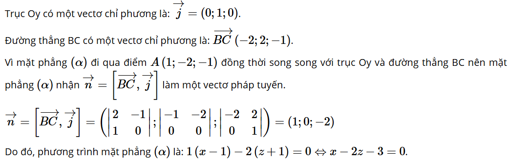 Luyện tập 7: Trong không gian Oxyz, cho các điểm A(1; −2; −1), B(4; 1; 2), C(2; 3; 1). Viết phương trình mặt phẳng (α) đi qua điểm A(1; −2; −1) đồng thời song song với trục Oy và đường thẳng BC.