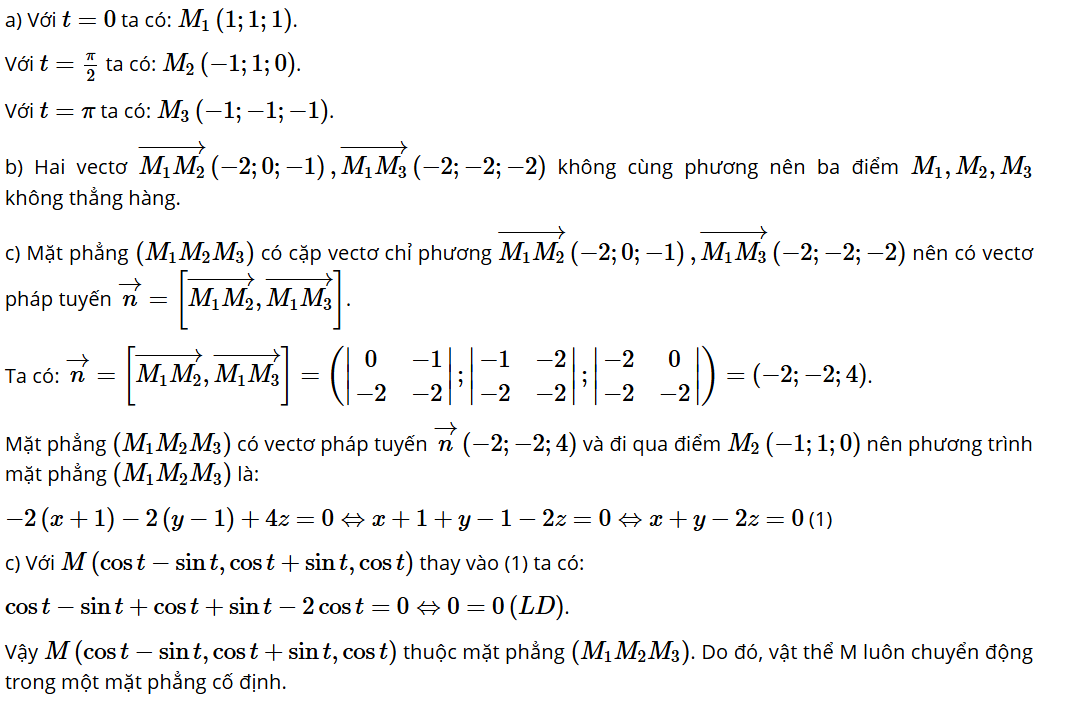 c) Vị trí M(cost – sint; cost + sint; cost) có luôn thuộc mặt phẳng (M1M2M3) hay không?