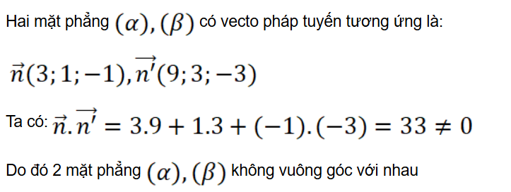 Luyện tập 9: Trong không gian Oxyz, hai mặt phẳng sau đây có vuông góc với nhau hay không? (α): 3x + y – z + 1 = 0, (β): 9x + 3y – 3z + 3 = 0.