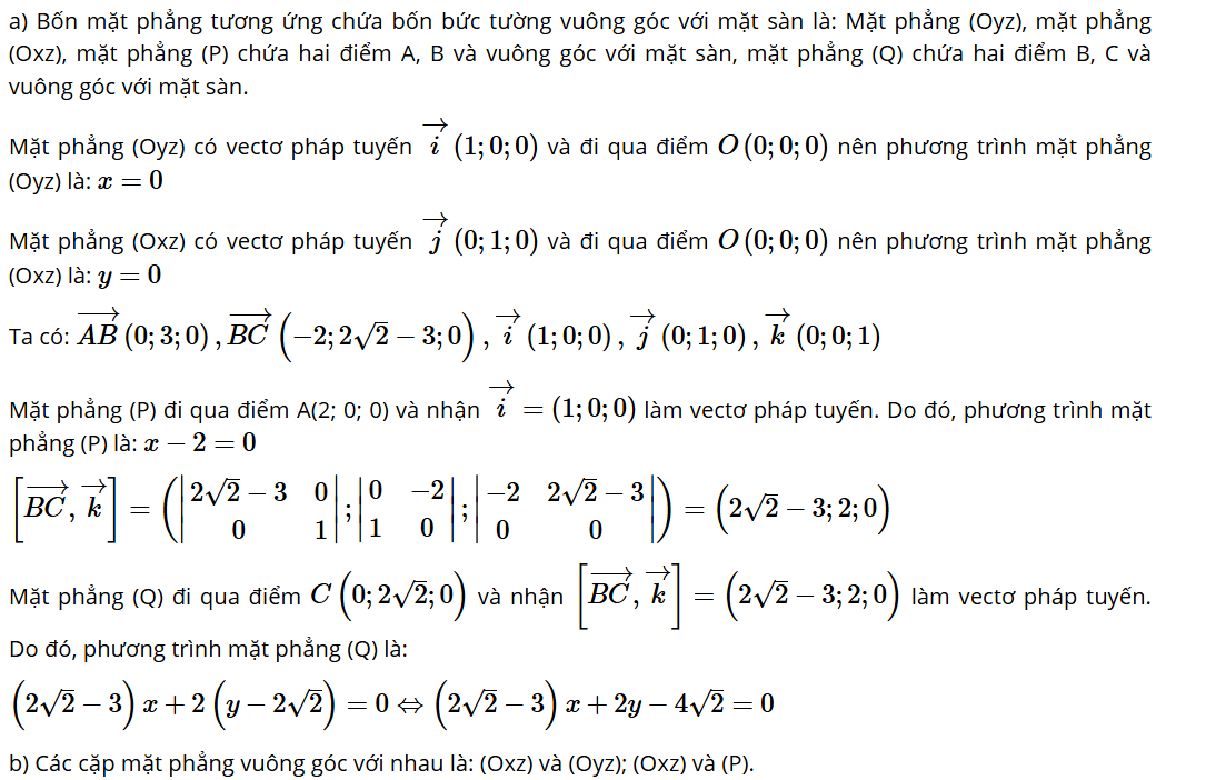 b) Trong bốn mặt phẳng tương ứng chứa bốn bức tường đó, hãy chỉ ra những cặp mặt phẳng vuông góc với nhau.