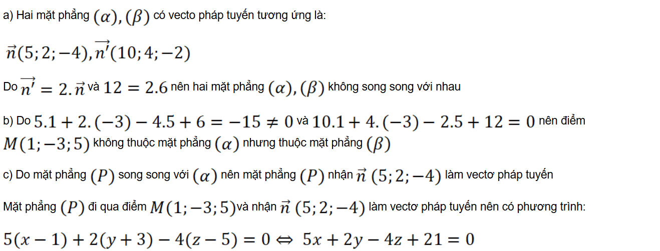 b) Chứng minh rằng điểm M(1; −3; 5) không thuộc mặt phẳng (α) nhưng thuộc mặt phẳng (β).