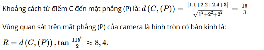 Vận dụng 5: (H.5.14) Góc quan sát ngang của một camera là 115°. Trong không gian Oxyz, camera được đặt tại điểm C(1; 2; 4) và chiếu thẳng về phía mặt phẳng (P): x + 2y + 2z + 3 = 0. Hỏi vùng quan sát được trên mặt phẳng (P) của camera là hình tròn có bán kính bằng bao nhiêu? (Làm tròn kết quả đến chữ số thập phân thứ nhất)