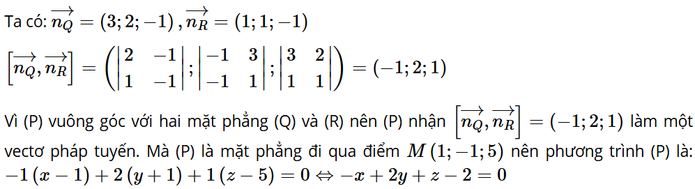 Bài 5.3: Trong không gian Oxyz, viết phương trình mặt phẳng (P) đi qua điểm M(1; −1; 5) và vuông góc với hai mặt phẳng (Q): 3x + 2y – z = 0, (R): x + y – z = 0.