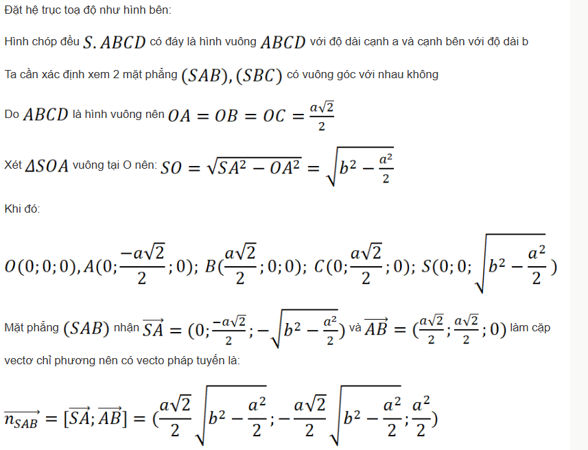 b) Hai mặt phẳng (α) và (β) vuông góc với nhau khi và chỉ khi hai vectơ pháp tuyến tương ứng vuông góc với nhau.