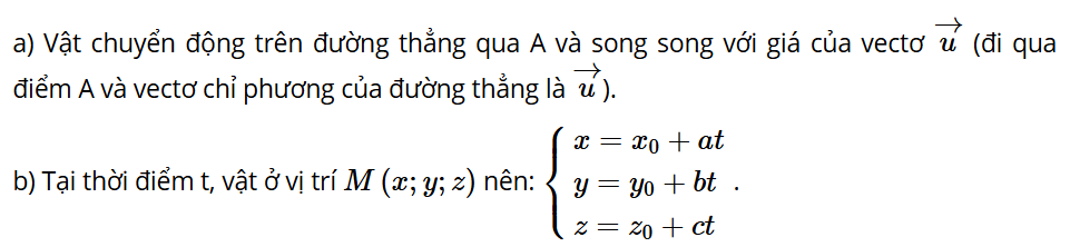 b) Giả sử tại thời điểm t (t > 0) tính từ khi xuất phát, vật thể ở vị trí M(x; y; z). Tính x, y, z theo a, b, c, x0, y0, z0 và t.