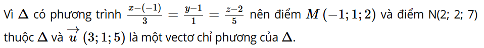 Luyện tập 3: Trong không gian Oxyz, cho đường thẳng . Hãy chỉ ra một vectơ chỉ phương của ∆ và hai điểm thuộc ∆.