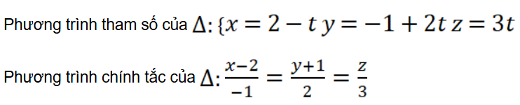 Luyện tập 4: Trong không gian Oxyz, viết phương trình tham số và phương trình chính tắc của đường thẳng ∆ đi qua điểm A(2; −1; 0) và có vectơ chỉ phương