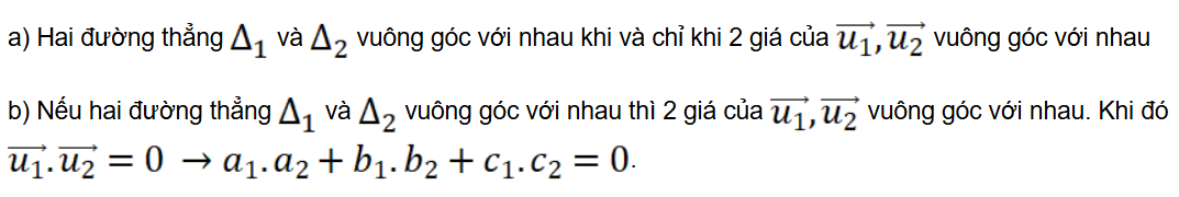 a) Hai đường thẳng ∆1 và ∆2 vuông góc với nhau khi và chỉ khi hai giá của có mối quan hệ gì?