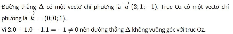 Luyện tập 7: Trong không gian Oxyz, cho đường thẳng . Hỏi đường thẳng ∆ có vuông góc với trục Oz hay không?