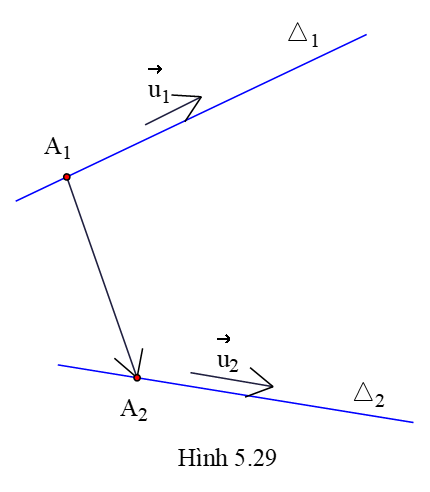 Hoạt động 6: Trong không gian Oxyz, cho hai đường thẳng ∆1; ∆2 lần lượt đi qua các điểm A1(x1; y1; z1), A2(x2; y2; z2) và tương ứng có vectơ chỉ phương (H.5.29).