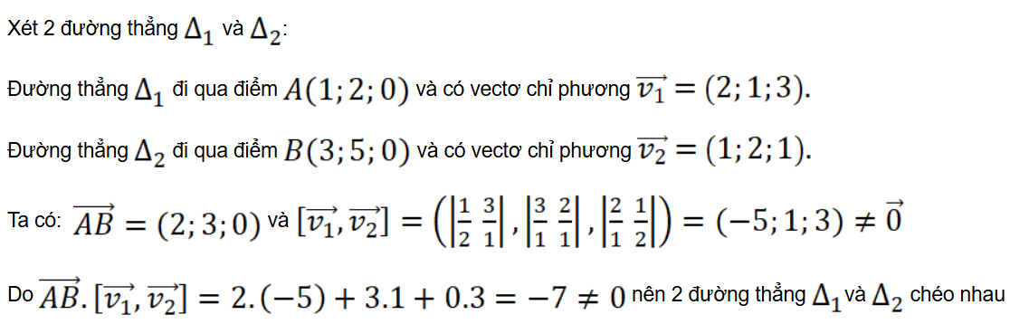 c) ∆1 và ∆2 chéo nhau khi và chỉ khi , và không đồng phẳng. Tức là: