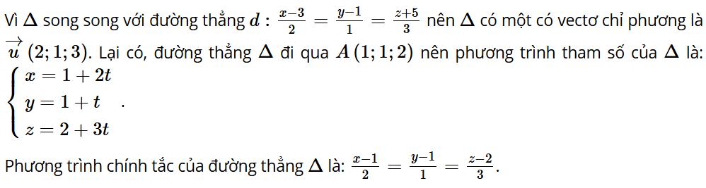 Bài 5.11: Trong không gian Oxyz, viết các phương trình tham số và chính tắc của đường thẳng ∆ đi qua điểm A(1; 1; 2) và song song với đường thẳng