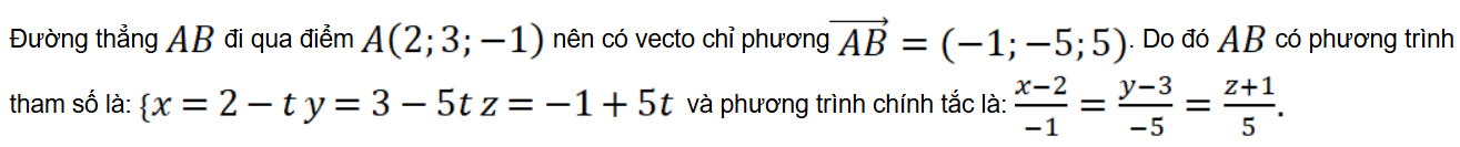 Bài 5.13: Trong không gian Oxyz, viết các phương trình tham số và chính tắc của đường thẳng ∆ đi qua hai điểm A(2; 3; −1) và B(1; −2; 4).