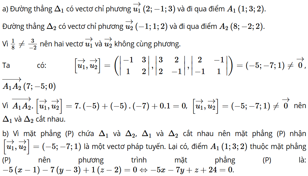 b) ∆1 và ∆2 cắt nhau khi và chỉ khi và không cùng phương và , và đồng phẳng. Tức là và .